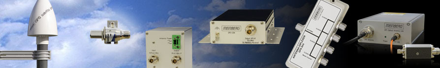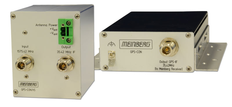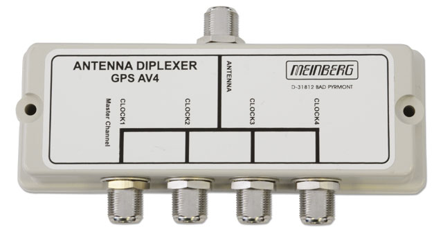 GOAL/A har to dioder. Den første indikerer om GPS-antennen er tilkoblet. Den andre viser at man har kontakt med 10 MHz fra GOAL/R. Da vet man at kabelen er hel. GPSAV4 GPS-splitter for Meinberg. Port 1/Master Channel gir spenning til GPS-antennen. Den skal alltid være tilkoblet ved bruk. GPSCON Omdanner GPS L1-antennen (1575,42 MHz) fra andre foretaks GPS-antenner til Meinbergs frekvens. Nå kan Meinberg-enheten ta imot GPS-signalene. |