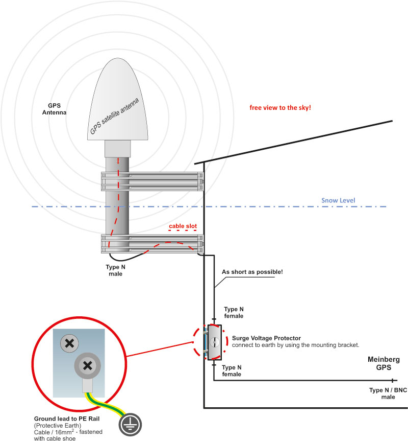 Download PDF: Installation av GPS-antenn Lynvern: ”MBG S-PRO” Når antennekabelen trekkes innendørs, bør lynvern installeres! Dette beskytter GPS-mottakeren og utstyret som har kabler til felles med mottakeren, mot lynnedslag. P-tron er fremstilt for Meinbergs utstyr. Lynvernet skal jordes slik at lynet går ned i jorden. Surge Voltage Protector (meinbergglobal.com) Kabellengde